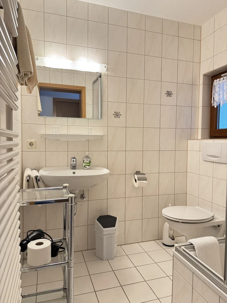 Das Badezimmer hat Dusche, Waschbecken und WC.