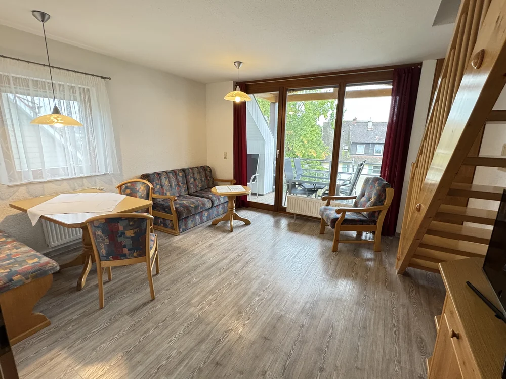Gemütlicher, heller Wohnbereich mit Sofa und Esstisch, Treppe (ca. 80 cm breit) zum OG.